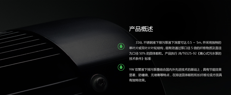 6、液下排污泵為立式結(jié)構(gòu),工作時泵體浸在液體中因而容易啟動,不存在排氣抽空問題,同時具有無泄露等特點,液下深度可達0.5-7米。