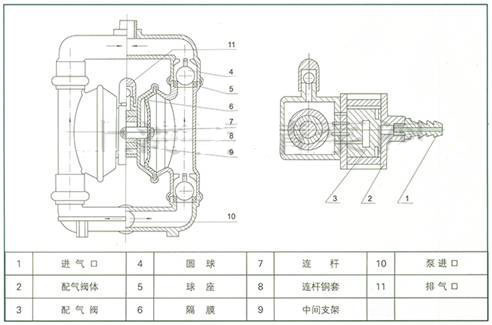 1、QBY氣動隔膜泵的兩個對稱各種腔中,各裝有一塊有彈性的隔膜6,聯(lián)桿7將兩塊隔膜結成一體,壓縮空氣從泵的進氣接頭1進入配氣閥3后,推動兩個工作腔內的隔膜,驅使聯(lián)桿聯(lián)接的兩塊隔膜同步運動。與此同時,另一工作腔中的氣體則從其隔膜的背后排出泵外;一旦到達行程終點,配氣機構則自動地將壓縮空氣引入另一工作腔,推動隔膜朝相反方向運動,這樣就形成了兩個隔膜的同步往復運動。每個工作腔中又設置有兩個單向球閥4,隔膜的往復運動,造成工作腔內容積的改變,迫使兩個單向球閥交替地開啟和關閉,從而將液體連續(xù)地吸入和排出。