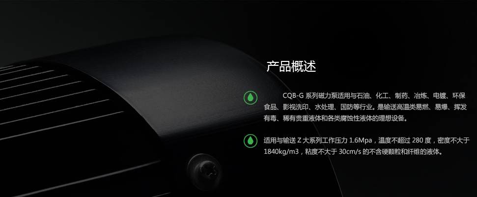 CQB-G 系列磁力泵適用與石油、化工、制藥、冶煉、電鍍、環(huán)保、食品、影視洗印、水處理、國防等行業(yè)。 是輸送高溫類易燃、易爆、揮發(fā)、有毒、稀有貴重液體和各類腐蝕性液體的理想設備。適用與輸送Z大系列工作壓力1.6Mpa,溫度不超過280度,密度不大于1840kg/m3,粘度不大于30cm/s的不含硬顆粒和纖維的液體。