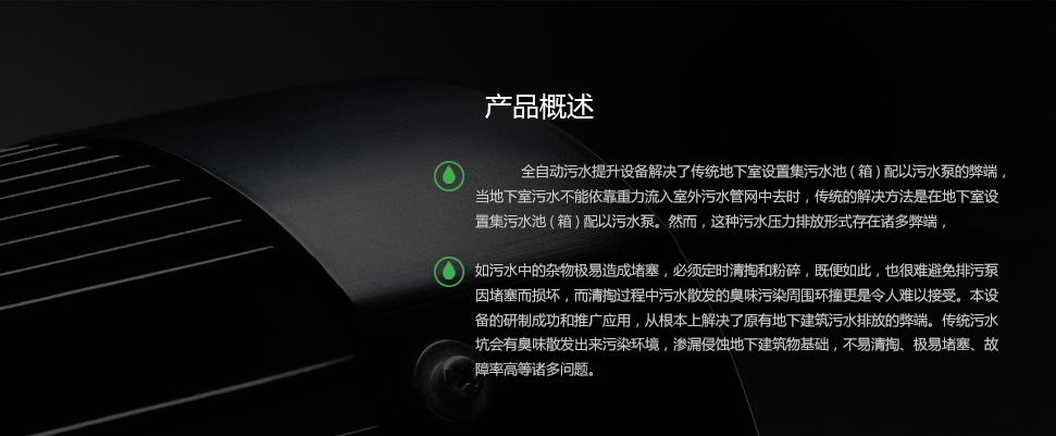 6、全自動智能控制:采用全智能控制技術,手動、自動轉換,降低了人工控制的難度和強度。獨有設計模式保證各種使用環(huán)境中污水提升設備的正常安全運行工作,并具有報警提示功能,保證用戶使用的連續(xù)性;