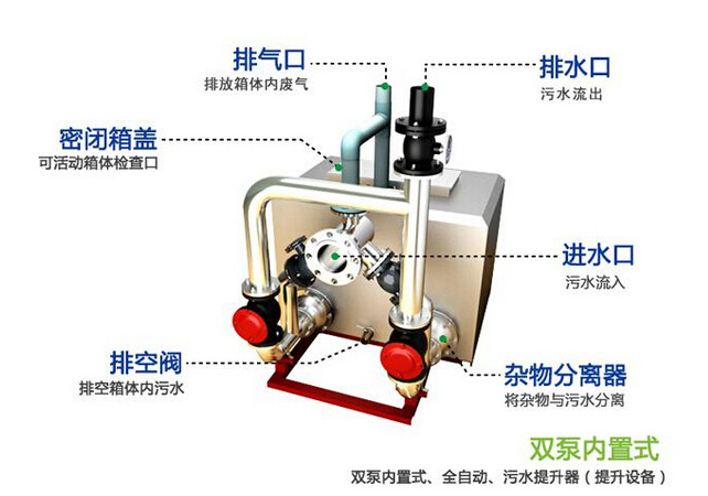 4、分體式雜物分離裝置:分體式雜物分離實現(xiàn)了雜物和污水的分離,雜物通過進水管路進入雜物分離裝置,并暫存在雜物分離器中,污水正常流入密閉式箱體,雜物不接觸排污 泵葉輪,排污泵工作排水時,通過排水管路,利用排污泵的排水水壓,帶走雜物分離器中暫存的雜物,提升排放到市政管網。徹底杜絕了用絞刀泵解決堵塞,但會纏繞泵、卡 泵的停機情況發(fā)生;