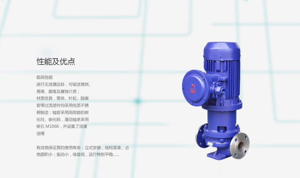 立式管道【CQG-L型磁力泵】是本單位在十多年設(shè)計制造臥式磁力泵經(jīng)驗基礎(chǔ)上開發(fā)的一種新型管道泵,它既具有ISG型管道離心泵的特點、又具有磁力化工泵的優(yōu)點,是Z新一代的無泄漏管道離心泵.具有體積小、安裝方便、占地面積小和運轉(zhuǎn)平穩(wěn)特點!
