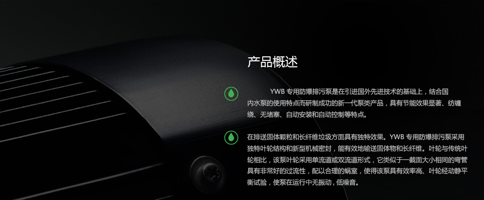 YWB防爆電機液下泵采用獨特葉輪結(jié)構(gòu)和新型機械密封,能有效地輸送固體物和長纖維。葉輪與傳統(tǒng)葉輪相比,該泵葉輪采用單流道或雙流道形式,它類似于一截面大小相同的彎管,具有非常好的過流性,配以合理的蝸室