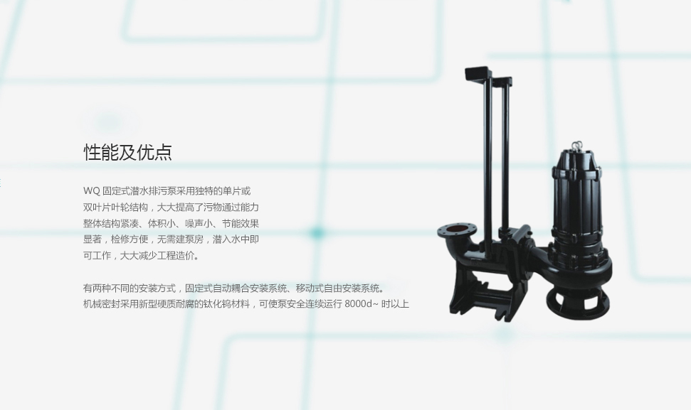 WQ固定式潛水排污泵使用于工廠商業(yè)嚴重污染廢水的排放、住宅區(qū)的污水排污站、城市污水處理廠排水系統(tǒng)、人防系統(tǒng)排水站、自來水廠的給水裝置