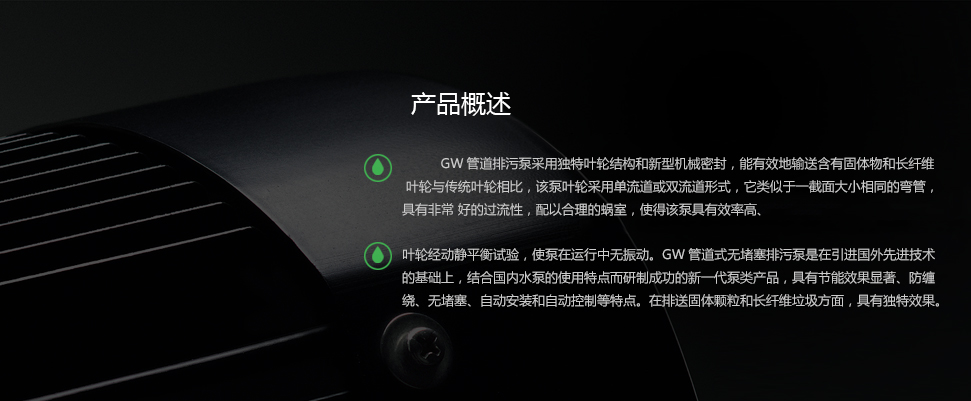 GW管道排污水泵是在引進國外先進技術的基礎上,結(jié)合國內(nèi)水泵的使用特點而研制成功的新一代泵類產(chǎn)品,具有節(jié)能效果顯著、防纏繞、無堵塞、自動安裝和自動控制等特點。在排送固體顆粒和長纖維垃圾方面,具有獨特效果